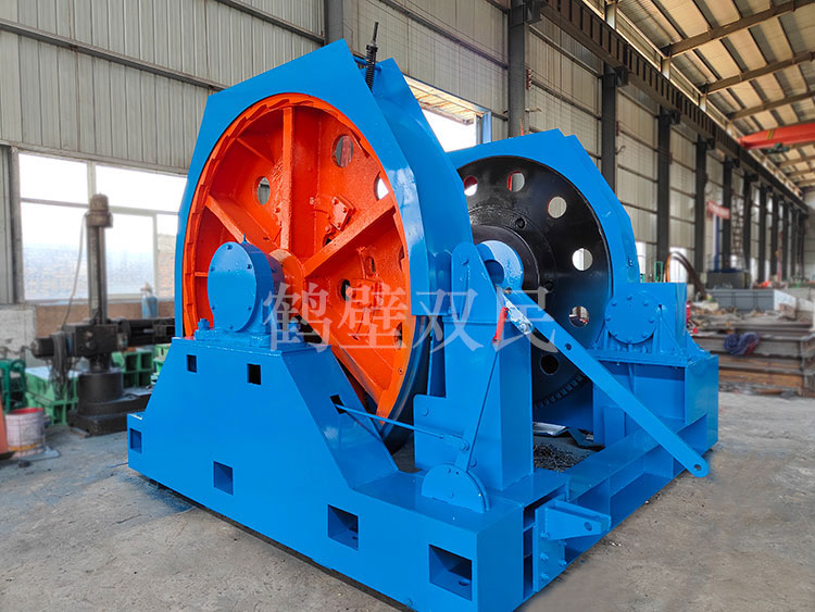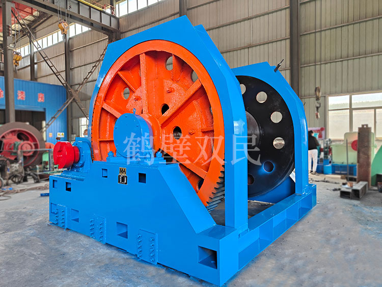 鑿井絞車主要用于煤礦、金屬礦和非金屬礦豎井井筒掘進時懸吊吊盤、水泵、水管、注漿泵、風筒等掘進設備和張緊穩(wěn)繩,該絞車系雙鋼絲繩懸吊。將減速機上的差動手把放在差動位置,若張緊穩(wěn)繩,可使兩根穩(wěn)繩的張緊力保持相等;若懸吊水管、注漿管、風筒等管類設備,可保證其被懸吊管類設備與地面保持垂直的狀態(tài)。如果懸吊吊盤等盤狀設備,需將其差動手把放在直通位置,才能實現(xiàn)兩繩繩速的一致。