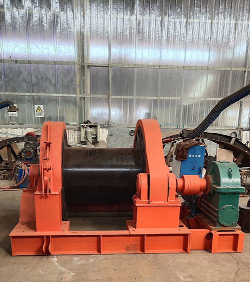 主軸裝置包括:主軸、齒輪、卷筒、制動(dòng)輪、軸承座及軸承等。減速器是采用球面蝸輪副減速,加有變速齒輪。轉(zhuǎn)換變速手柄快慢速位置,可變換快慢兩種速度。工作制動(dòng)器采用瓦塊式制動(dòng)器,啟動(dòng)電機(jī),電動(dòng)液壓推動(dòng)器松閘。