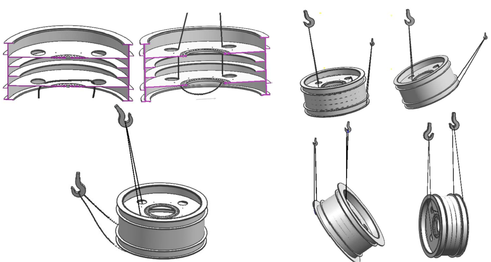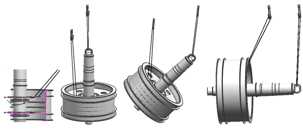 吊點(diǎn)附近的輪子輪緣之間,需用螺紋千斤頂輔助支撐,以防止在起吊中變形;起吊翻轉(zhuǎn)過(guò)程中人員與工件要保持足夠的安全距離,避免千斤頂墜落傷人。