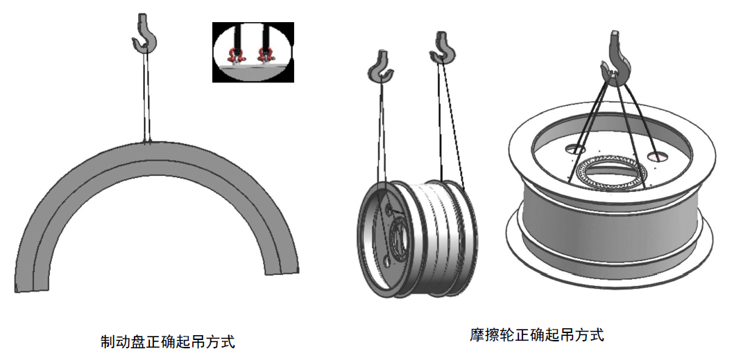 采用兩根等長(zhǎng)鋼絲繩,左、右側(cè)各掛一根鋼絲繩,吊點(diǎn)在由上到下第三個(gè)輪子的上、下槽鋼中間空隙處,不準(zhǔn)許直接兜吊下側(cè)槽鋼。此種起吊方式嚴(yán)禁帶軸承座及端蓋。