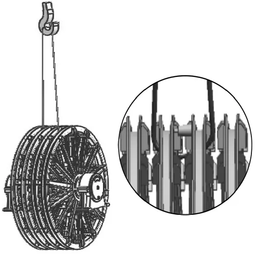 4m以下規(guī)格天輪裝置:采用兩根等長(zhǎng)鋼絲繩。鋼繩兜吊中間兩個(gè)輪子的輪緣,兩根鋼絲繩分別掛在同一處槽鋼的左、右兩側(cè)。為防止輪子變形,兩吊掛輪子之間需用千斤頂支墊。
