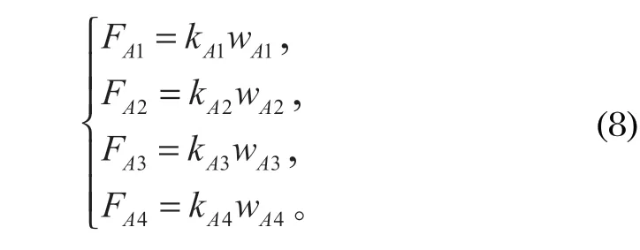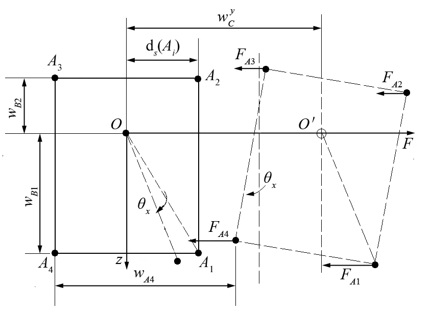 提升容器的罐耳在其中一個(gè)方向不對(duì)稱布置,由于 4 根罐道繩底部張緊力相同,在容器上下 4 個(gè)約束點(diǎn)平面上,罐道繩的橫向剛度相同,其力臂越大的約束點(diǎn),水平位移越大,它對(duì)容器的水平約束力越大,使容器產(chǎn)生一個(gè)水平轉(zhuǎn)矩。當(dāng)容器在水平 y 軸上受外力 F 作用,在罐耳 A1、A2、A3、A4 處產(chǎn)生的橫向位移依次為 wA1、wA2、wA3 和 wA4。罐耳 A1、A2、A3、A4 處的橫向力依次為