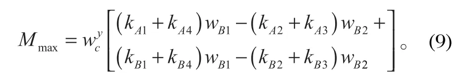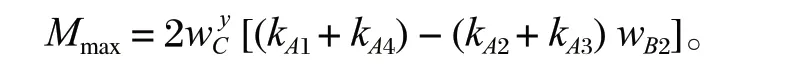 在橫向位移不變的情況下,提升容器的靜態(tài)轉(zhuǎn)矩與罐道繩橫向剛度呈線性關(guān)系。當(dāng)容器在水平面內(nèi)達(dá)到受力平衡時(shí),容器產(chǎn)生了一個(gè)扭轉(zhuǎn)角 θx。Mmax越大,扭轉(zhuǎn)角 θ x 越大,其扭轉(zhuǎn)引起在 y 軸的位移為wBi θx。
