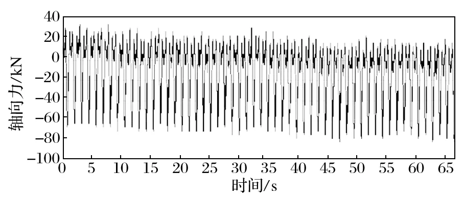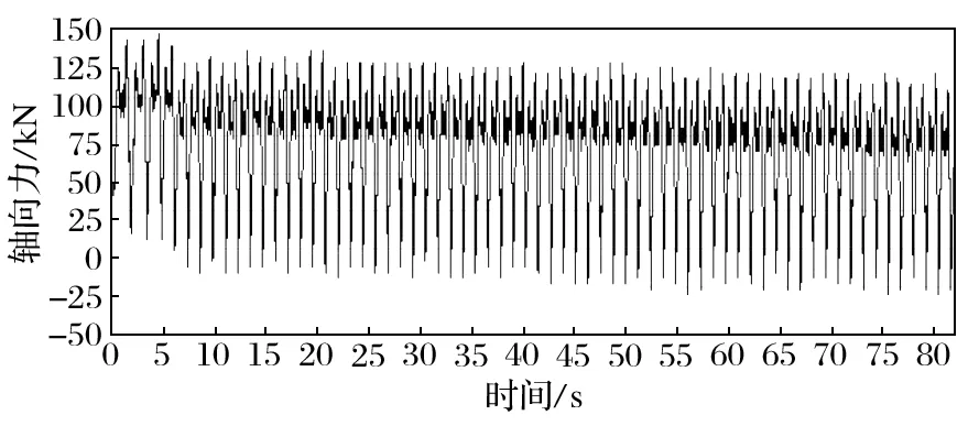 在左罐重載上提穩(wěn)定運行過程中,軸向力的zui大值為 141.623 kN,zui小值為-30.038 kN,平均值為 69.656 kN;峰值出現(xiàn)在 171.60 kN 處,有效值為76.301 kN。在右罐重載上提穩(wěn)定運行過程中,軸向力的zui大值為 35.705 kN,zui小值為-81.171 kN,平均值為-12.662 kN;峰值出現(xiàn)在 116.875 kN處,有效值為 30.942 kN。