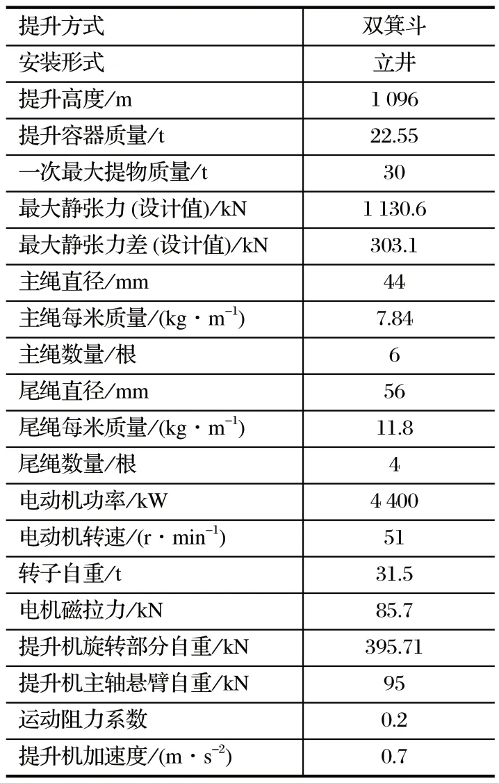 本研究以某礦 JKM-4.5×6PⅢ多繩摩擦式提升機為例,該提升機由中信重工機械股份有限公司設(shè)計制造,其系統(tǒng)參數(shù)如表1 所列。主軸傳動側(cè)采用 FAG雙列調(diào)心滾子軸承,軸承型號為 240/1060BK30.MB(FAG),軸承當(dāng)量動載荷 Cr=18 600 kN,e =0.27,Y=2.47。