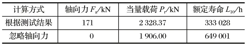 4.3 計算結(jié)果與測試結(jié)果對比 根據(jù)傳統(tǒng)方法得到軸向力為 0 kN,測試方法得到軸向力為 171 kN。按照軸承壽命計算公式,利用兩方法分別計算,其結(jié)果如表2 所列。