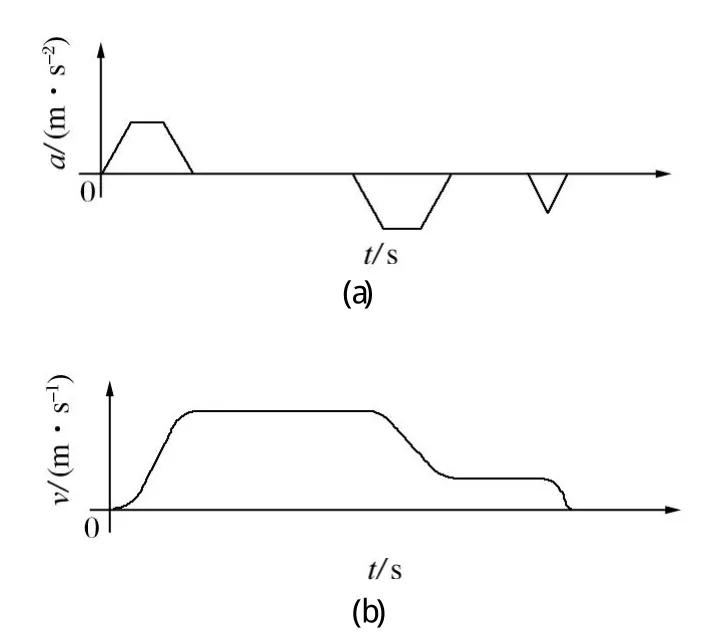 (4)重視提升系統(tǒng)沖擊限制,常用的有矩形加/減速度控制和梯形加/減速度控制,分別如圖1、2所示。采用梯形加/減速度控制曲線,并且加/減速度的變化率不宜大于 0.3 m/s3,以減少加/減速過程中提升鋼絲繩所受的動(dòng)張力及彈性振動(dòng)。新建礦井尤其是深井提升系統(tǒng)宜采用恒減速制動(dòng),可有效控制緊急制動(dòng)過程中提升鋼絲繩的動(dòng)張力,同時(shí)避免提升鋼絲繩打滑現(xiàn)象。