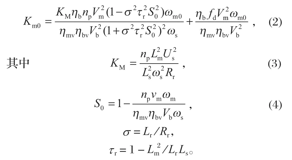 式中:np 為電動機的極對數(shù);Vm 為液壓馬達的排量;ωs 為電網(wǎng)供電頻率;Ls、Lr、Lm 分別為定子電感、轉子電感以及定子與轉子之間的互感;Us 為端電壓。