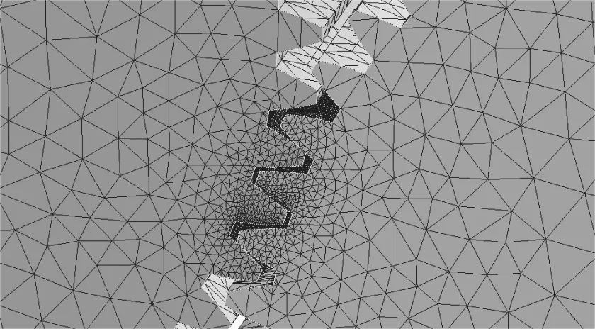 在 SolidWorks 中對同步齒輪進行建模并調(diào)整,確保同步齒輪不會出現(xiàn)干涉。為了提高仿真精度和數(shù)據(jù)的可靠性,對靜強度仿真過程中參與嚙合的幾對輪齒表面網(wǎng)格化。齒面網(wǎng)格細化模型如圖5所示。