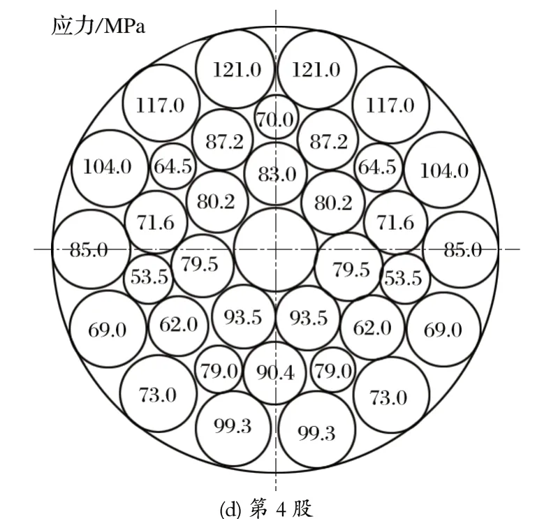 將鋼絲繩纏繞在直徑為 2 m 的天輪上,在實際求解時,將計算內(nèi)部接觸點(diǎn)位置作為求解的計算點(diǎn)。此時,選取位于摩擦天輪繩槽上下兩側(cè)和右側(cè)的部分繩股作為研究對象,并且沿著順時針方向進(jìn)行標(biāo)記,標(biāo)記出第 1、2、3、4 股。仿真分析得到的鋼絲繩應(yīng)力分布如圖4 所示。